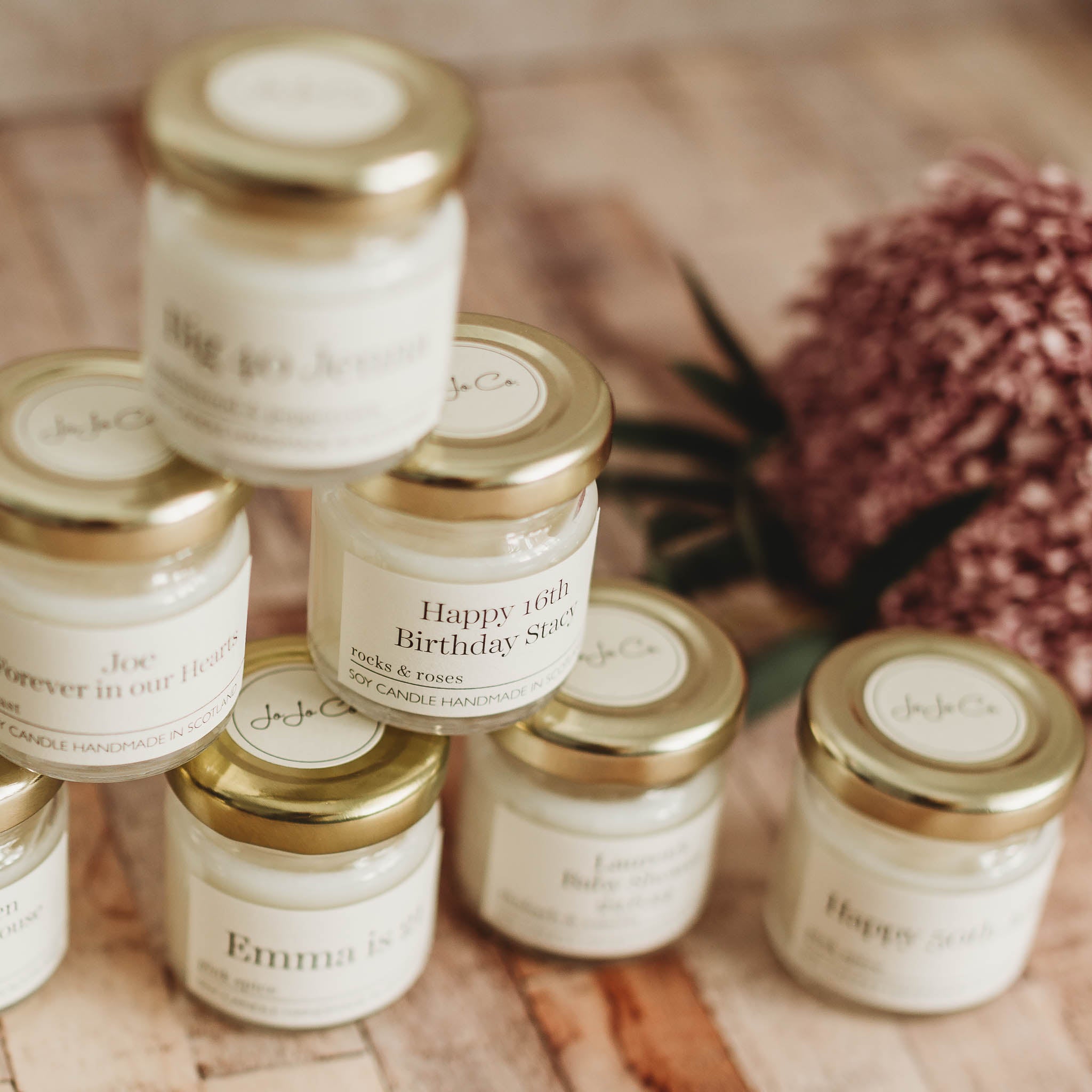 Our personalised mini candles come in seven gorgeous JoJo Co. fragrances, each crafted to evoke a specific mood or memory: